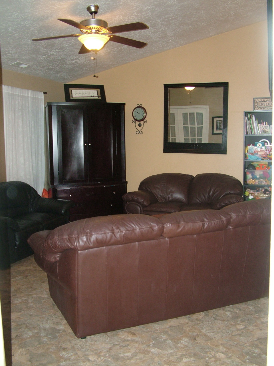 So it stayed like this last summer. Our poor sectional was literally falling apart. So we tossed half of it while I hunted down a good deal on our leather set.