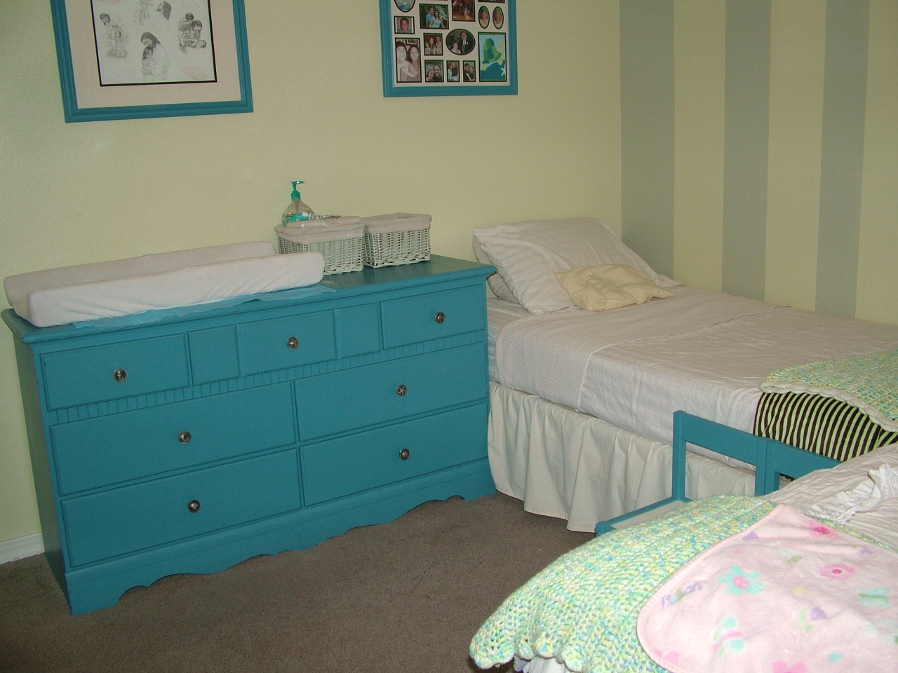 So this is how their room looked with no crib and the full size bed crammed in. I knew that we were moving so I was o.k. with the temporary cramped bedding situation.