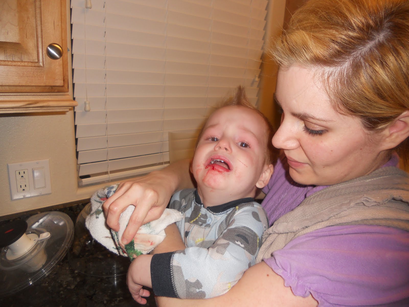 After getting the back to my parents house and in jammies Regan decided to take a dive into the coffee table. The amount of blood was spectacular. My Dad knows me too too well and was right there with his camera before I could even ask. My Mom thought we were crazy, but I like to document the good, the bad, and the ugly. I was pleasantly surprised at how fast a split lip heals.