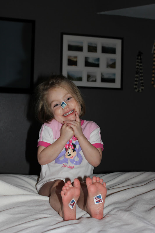 And because every post needs a picture. Kaylee found herself some stickers. Jon brought her in to show me and to get a photo before peeling the stamps off of her and explaining that they were not in fact stickers.
