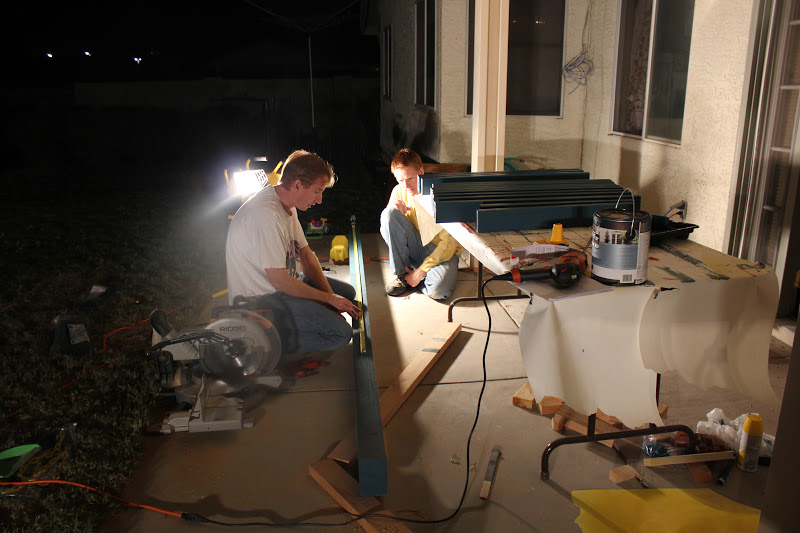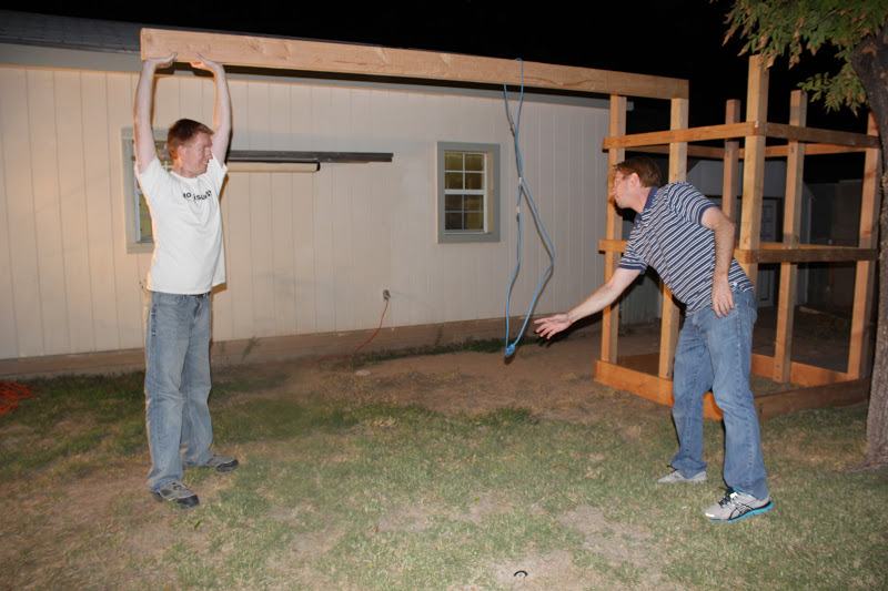 So out came the flood lights and the boys got to measuring. They needed new measurements since I got different swings than in the plans. We also flipped the whole thing to face the opposite than in the plans. I sure am glad that the boys could figure all those numbers out and make everything work. IF it was up to me we’d still be staring at the miter saw in horror. Math and I are not on good terms.