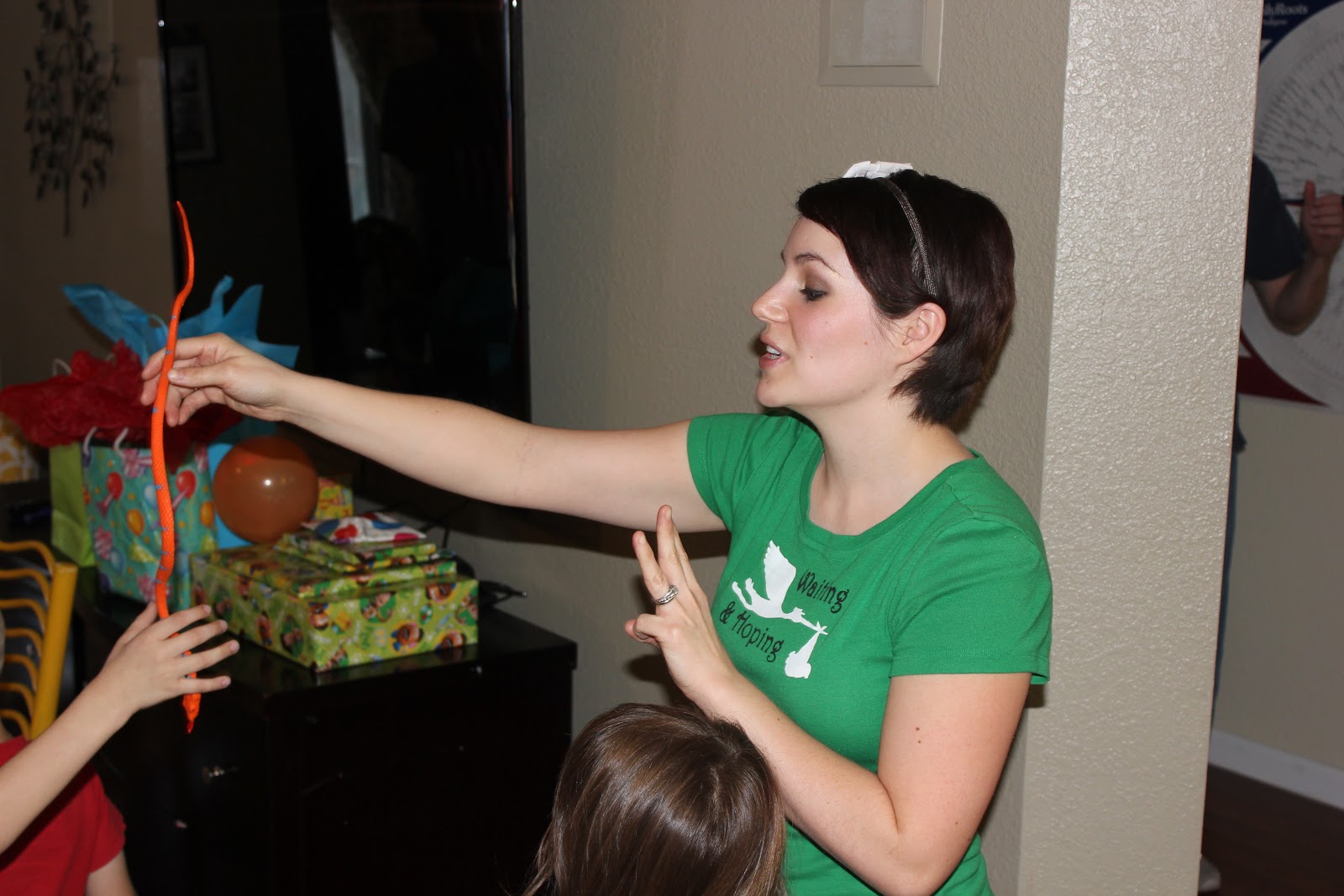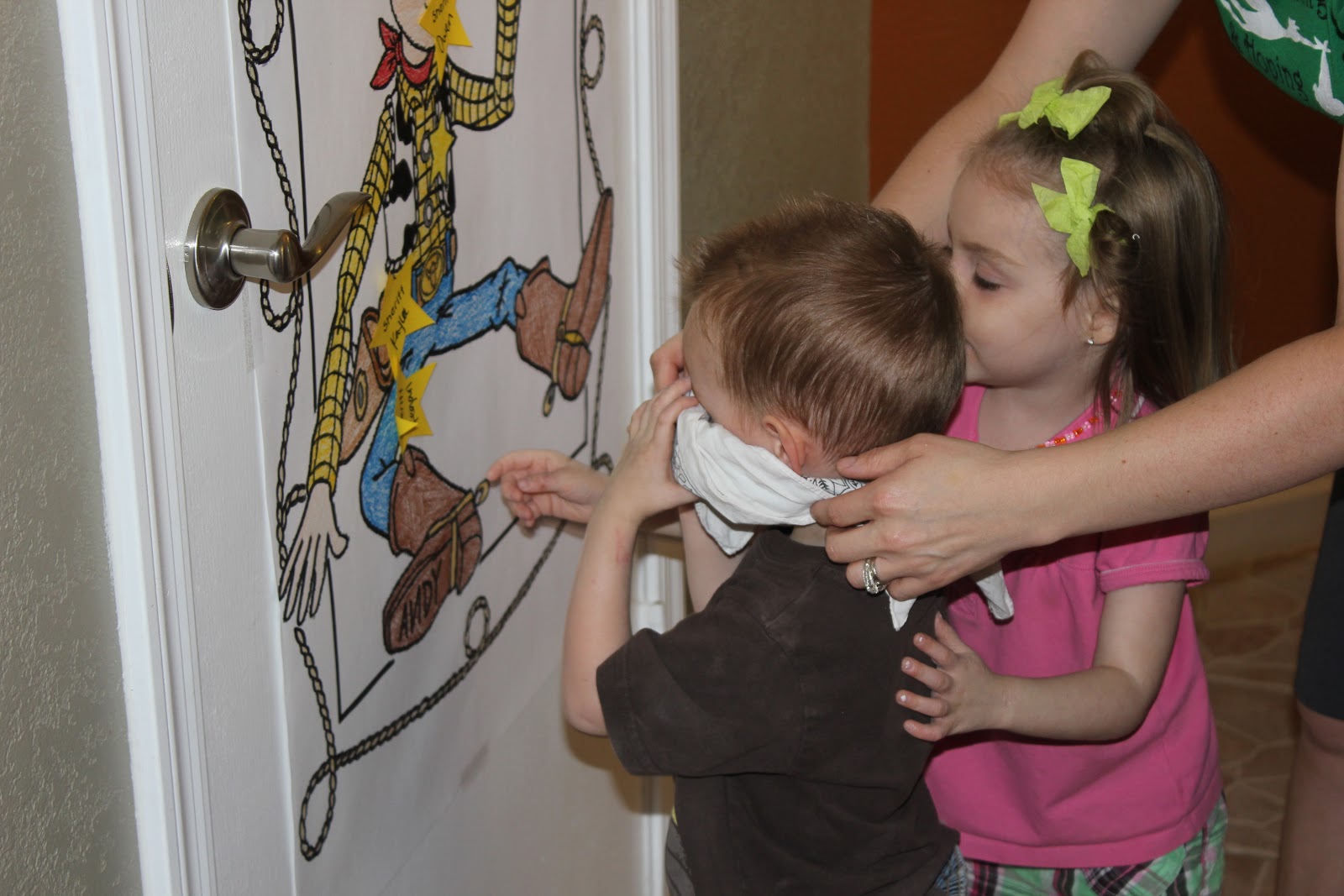We played pin the badge on Woody, and get the snake in the boot. Here I am explaining that they would each get three tosses.