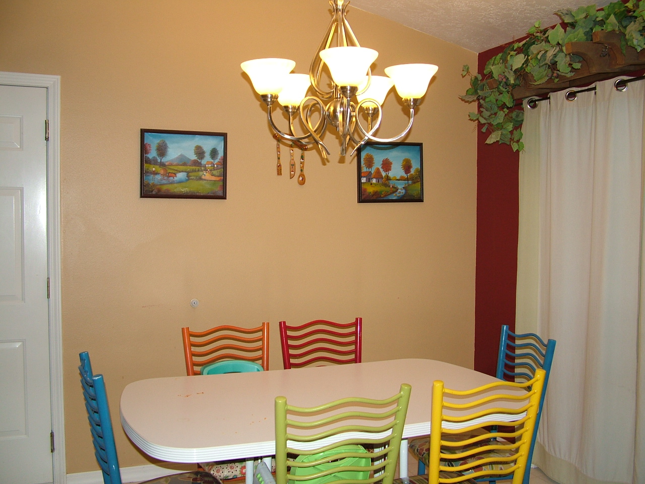 We did lots of painting in this space. We also replaced the chandelier, and vertical blinds (we hate those things). I chose to do big grommet curtain panels for easy opening and closing, and also so that I could take them down and throw them in the wash (done that lots) whenever I wanted. I made Jon hang up the faux pergola (which he HATES and is therefore getting left behind as I promised him he wouldn’t EVER have to move that thing again.) and grape vines above.