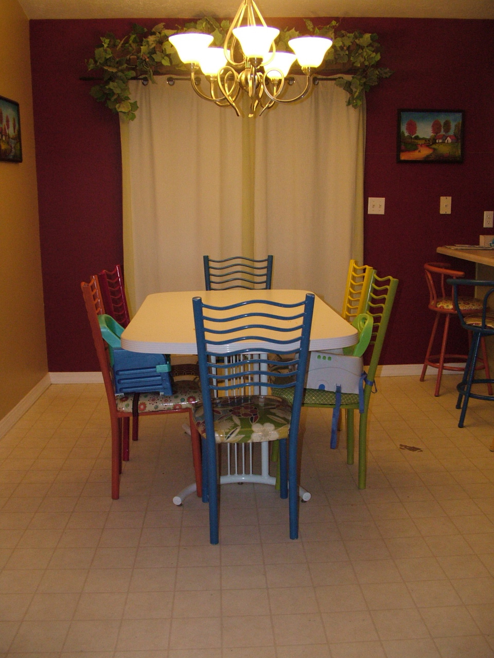 I did the bar-stools in yellow, orange, and blue. It took me a while to find an orange that went well enough with the other fabrics, and since orange is Kaylee, and Jon’s favorite color it couldn’t be left out. I am hoping to be able to change out the table legs in the near future.