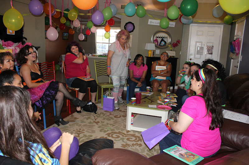 We had all the guests dress up. Which was a riot. Also kind of scary how easy it was to find outfits. 80’s style clothing is sadly coming back. We ate great food, played cheesy shower games (prizes were AWESOME though, romantic 80’s teen movies like “Pretty in Pink” and “Say Anything”), and watched Jack’ee open a slew of gifts.