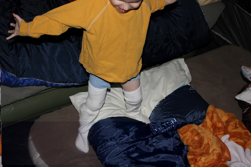 I packed nice warm jammies for the children. Regan’s last potty break ended with pee all over. Footed zipper jammies are not so easy to tree pee in I guess…. I did not pack spare jammies. So he wore his one spare long sleeve shirt, underwear, and Jon’s spare soaks. He was toasty warm the few times I checked on him. Jon got the children some AWESOME sleeping bags. They stayed nice and warm.